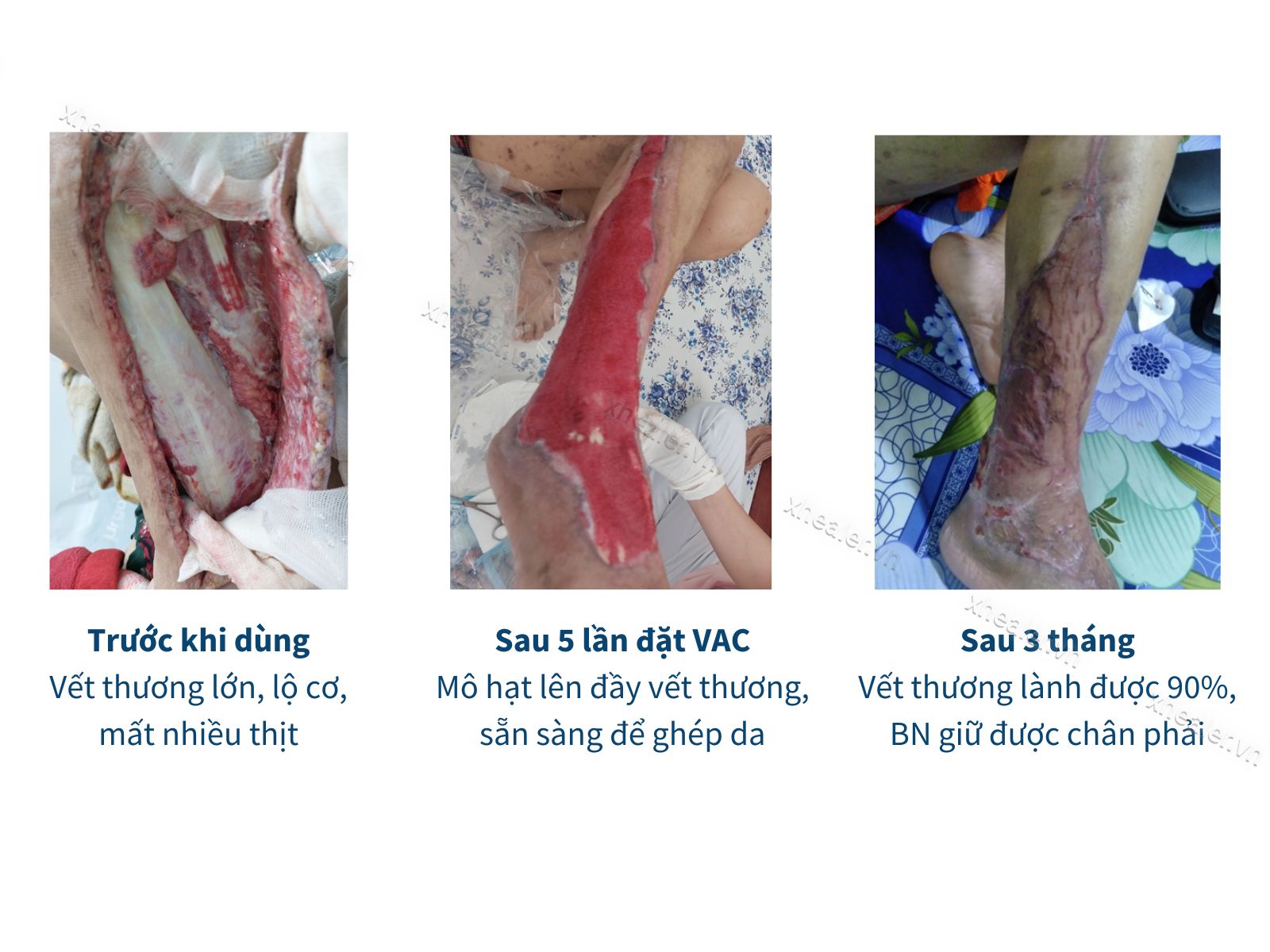 Sau nhập viện, bệnh nhân được cắt lọc, chăm sóc tại chỗ, điều trị nội khoa tích cực gồm kháng sinh mạnh, ổn định đường huyết và bổ sung dinh dưỡng giàu acid amin chuyên biệt để tăng tưới máu, tăng tổng hợp mô hạt để làm đầy vùng mô bị mất đi. Kết hợp với đặt VAC (liệu pháp hút áp lực âm), vết thương nhanh chóng được làm đầy và đủ điều kiện ghép da. Kết quả là sau gần 3 tháng điều trị, vết thương đã hồi phục tốt và bệnh nhân giữ lại được chân phải của mình.