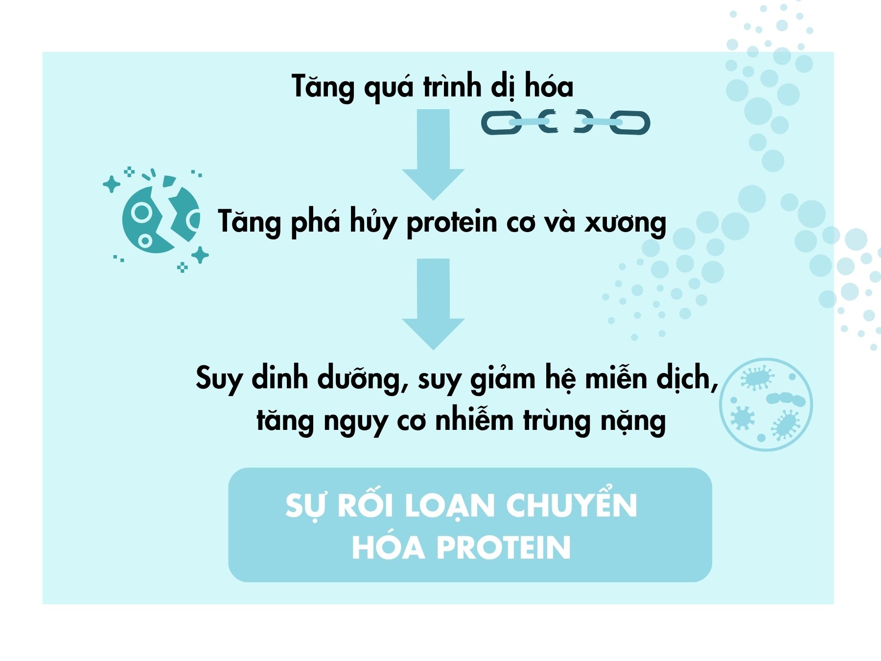 Sự gia tăng chuyển hóa làm tăng quá trình dị hóa, dẫn đến gia tăng sự phá hủy protein của cơ và xương. Hệ lụy là làm mất một phần khối lượng của protein cơ xương và phát triển một số biến chứng thứ phát như suy dinh dưỡng, suy giảm hệ miễn dịch làm tăng nguy cơ nhiễm trùng nặng. Hiện tượng này được gọi là sự rối loạn chuyển hóa protein – vấn đề nghiêm trọng nhất ở bệnh nhân bỏng.