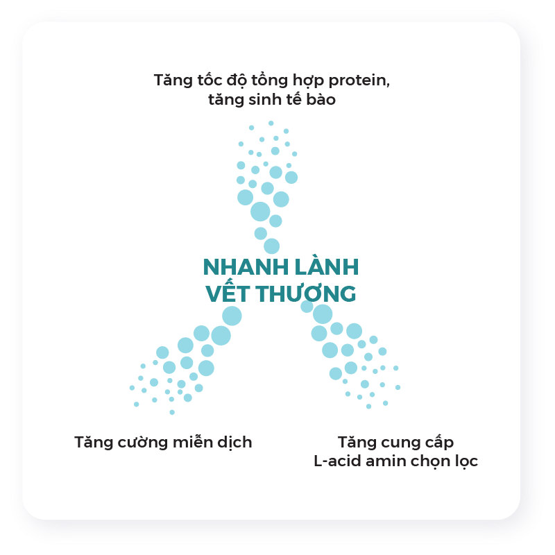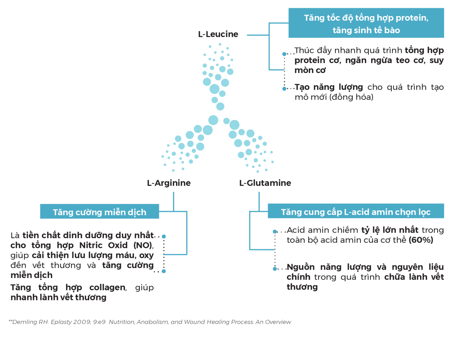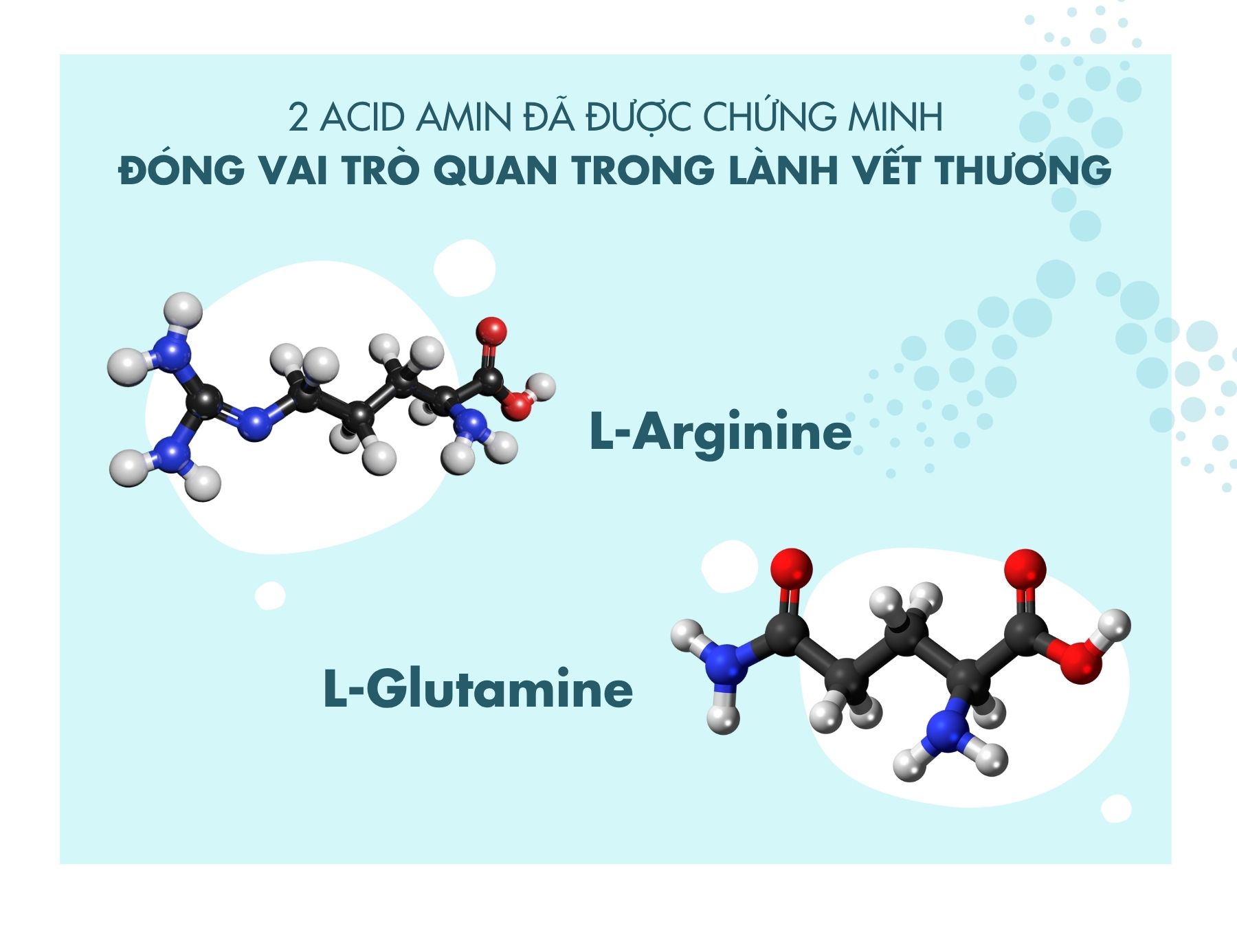 Trong 20 acid amin tham gia cấu tạo nên protein, L-Arginine, L-Glutamine, L-Leucine là 3 acid amin đã được chứng minh đóng vai trò quan trọng trong lành vết thương.