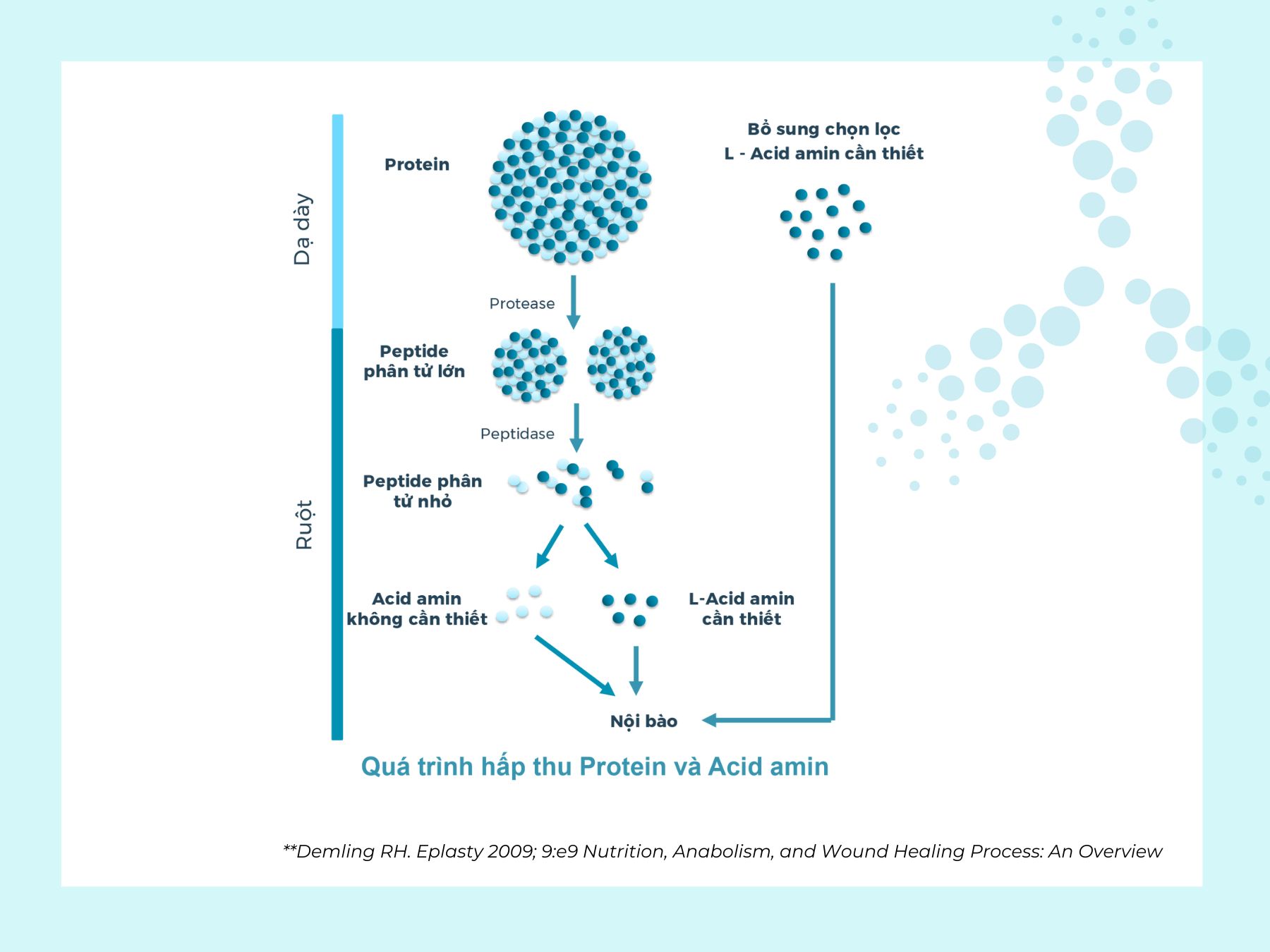 Protein được cấu thành bởi các acid amin bao gồm acid amin thiết yếu và không thiết yếu. Quá trình hấp thu của protein diễn ra chậm do phải thủy phân nhiều bước thành phân tử nhỏ hơn và đơn phân acid amin mới có thể hấp thu vào cơ thể. Và chỉ có các acid amin thiết yếu và thiết yếu có điều kiện là thành phần sẽ tham gia cấu trúc tế bào cơ, da, nội tạng, mô liên kết, các enzyme, kháng thể miễn dịch…phục vụ cho quá trình lành vết thương. Để đảm bảo đầy đủ hàm lượng các acid amin trên thì lượng protein toàn phần cần cung cấp cho cơ thể là rất lớn, điều này khó thực hiện được bởi bổ sung lượng lớn protein toàn phần có thể gây khó hấp thu và tiêu chảy, hiện tượng này càng rõ ở bệnh nhân bỏng do bị rối loạn tiêu hóa và hấp thu. Trong khi nếu bổ sung lượng vừa đủ protein toàn phần, thì lại không đáp ứng đủ nhu cầu một số acid amin của cơ thể và lại dư thừa một số acid amin không cần thiết. Do đó, việc bổ sung thêm một cách chọn lọc một số acid amin cần thiết cho quá trình lành vết thương là một giải pháp để lựa chọn lúc này.