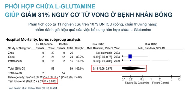 Bên cạnh đó, phân tích gộp của Zanten và cộng sự năm 2015 từ 11 nghiên cứu trên 1079 bệnh nhân ICU (bỏng, chấn thương nặng) nhằm đánh giá hiệu quả của việc bổ sung hỗn hợp chứa L-Glutamine so với nhóm chứng (điều trị thường qui). Kết quả nghiên cứu cho thấy, trên nhóm bệnh nhân bỏng, sử dụng phối hợp chứa L-Glutamine giúp giảm 81% nguy cơ tử vong ở bệnh nhân bỏng với RR = 0,19 và kết quả này là có ý nghĩa thống kê với p = 0,01.