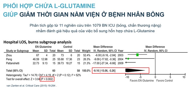 Kết quả từ nghiên cứu của Zanten cũng cho thấy việc sử dụng phối hợp chứa L-Glutamine giúp giảm thời gian nằm viện ở bệnh nhân bỏng (Mean Difference = – 9,16) và kết quả này là có ý nghĩa thống kê với p = 0,002.