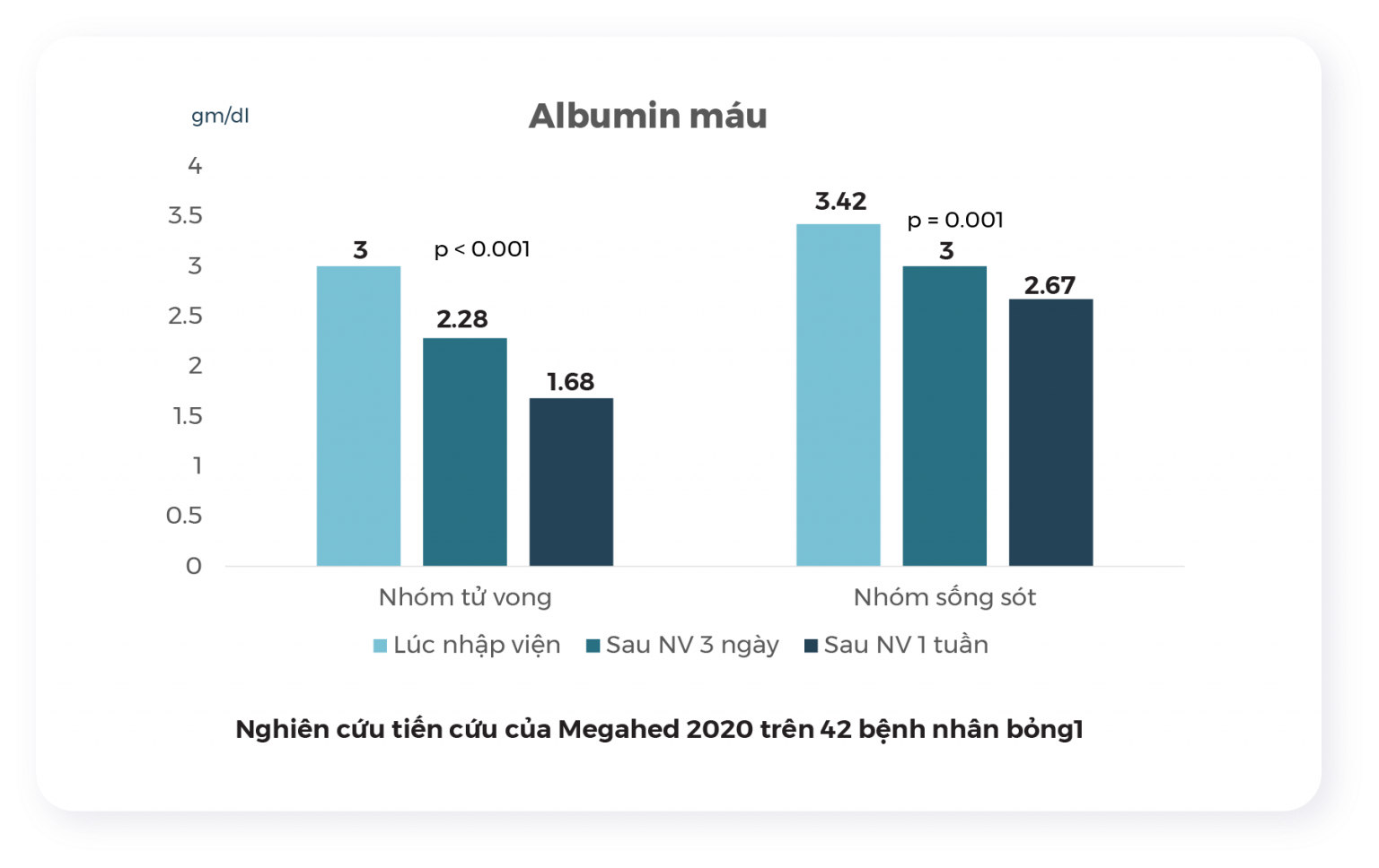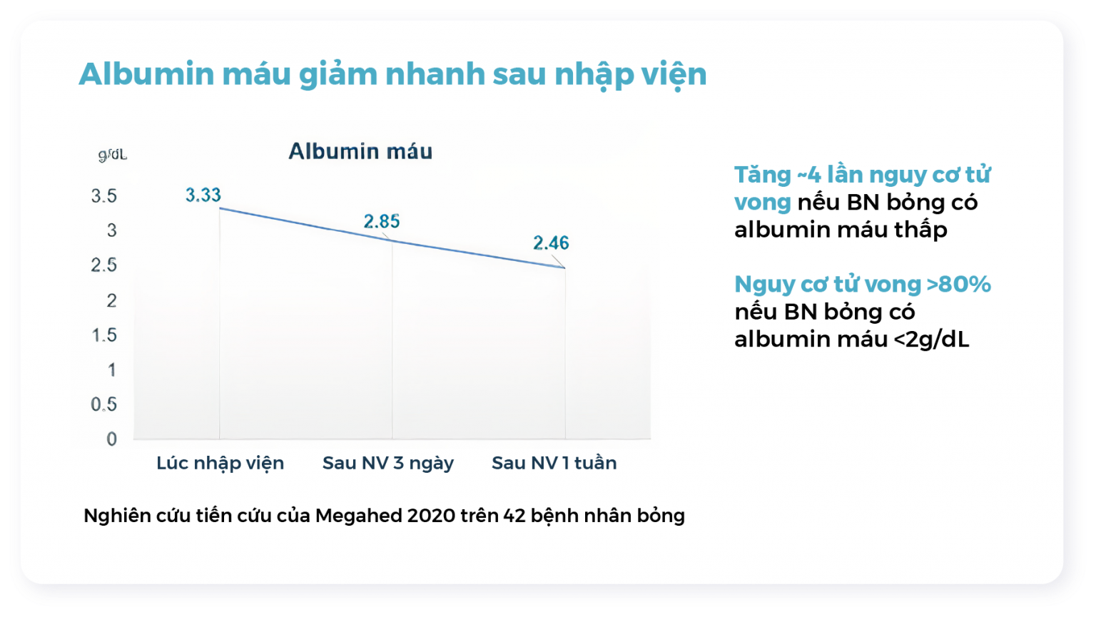 Thật vậy, nghiên cứu tiến cứu của Megahed năm 2020 trên 42 bệnh bỏng cho thấy albumin máu của bệnh nhân bỏng giảm nhanh sau nhập viện và tăng gấp 4 lần nguy cơ tử vong nếu bệnh nhân bỏng có albumin máu thấp. Tương tự nghiên cứu của Olivia năm 2013 cũng cho thấy nguy tử vong là trên 80% nếu bệnh nhân bỏng có albumin máu < 2 g/dL.