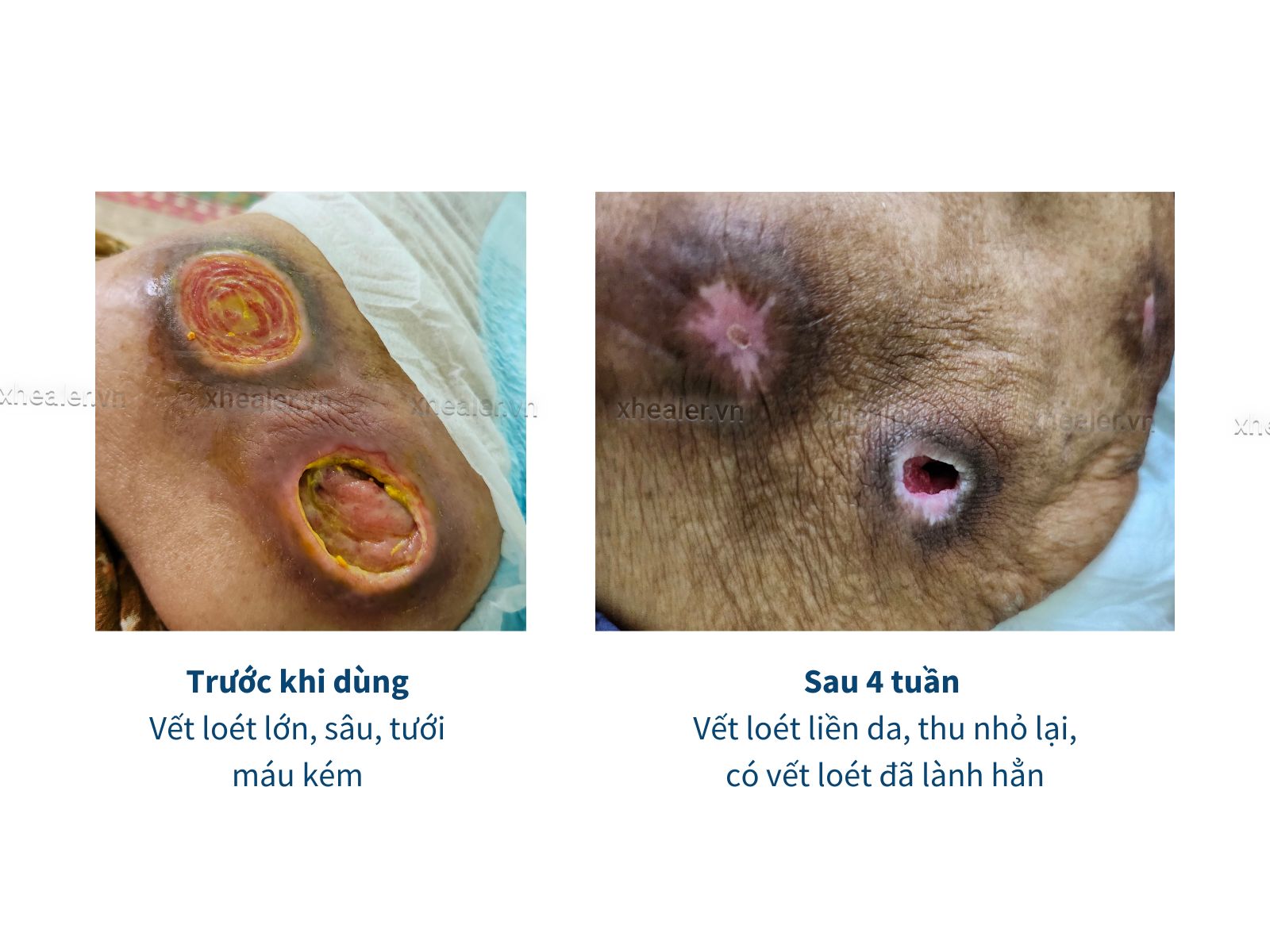 BN sau đây lớn tuổi, nằm liệt 1 chỗ, suy kiệt, có 2 vết loét tì đè ở mông và hông. Kết hợp với xoay trở, vệ sinh vết loét, bổ sung dinh dưỡng chuyên biệt X-Healer, sau gần 1 tháng sử dụng, các vết loét gần như lành hẳn.