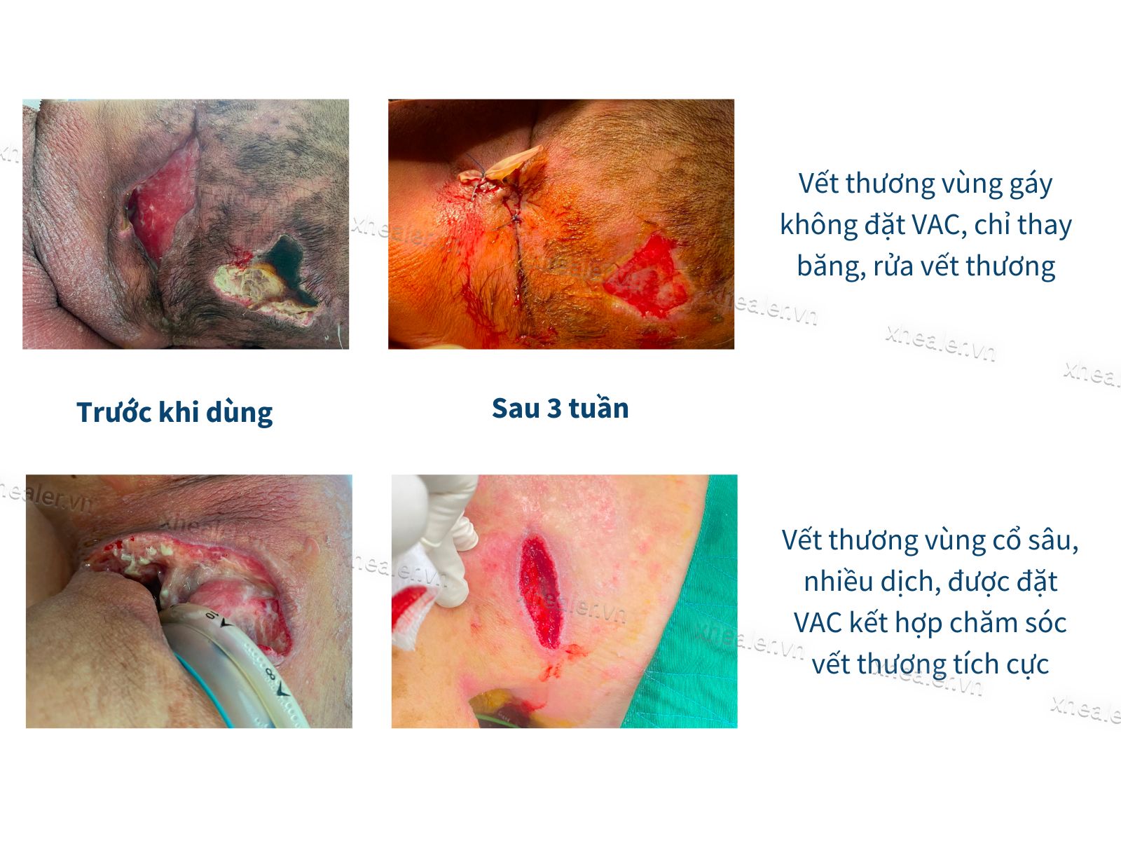 Bệnh nhân dưới đây bị đái tháo đường nhưng bỏ điều trị, vỡ mủ áp xe ở cổ và gáy, đã được rạch dẫn lưu nhiều lần nhưng không lành. Sau khi được chuyển khoa để điều trị chuyên sâu vết thương ở vùng cổ và gáy, chăm sóc vết thương tích cực, đặt VAC kết hợp với bổ sung dinh dưỡng chứa các acid amin chuyên cho lành vết thương, bệnh nhân đã được khâu da và xuất viện sau 3 tuần điều trị.