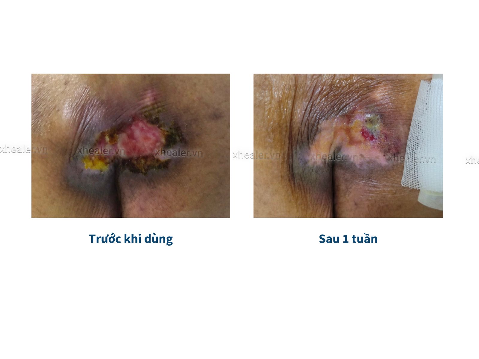 BN dưới đây 99 tuổi, nằm liệt giường sau tai biến, bệnh nền tiểu đường. Tuy người chăm sóc đã xoay trở rất tốt nhưng BN vẫn xuất hiện loét tì đè độ II. Do phát hiện sớm và được thăm khám kịp thời, BN được hướng dẫn cách chăm sóc vết thương, bổ sung dinh dưỡng kết hợp sử dụng X-Healer 3 gói/ngày, vết loét đã lành lại chỉ sau 1 tuần.