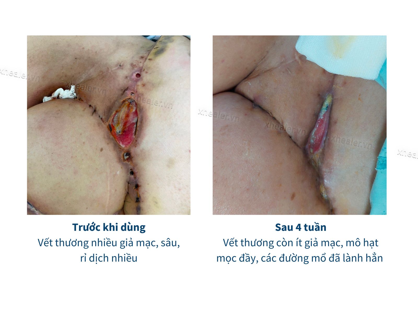 Sau khi được hội chẩn chuyên khoa dinh dưỡng, bệnh nhân được tư vấn chế độ ăn cao năng lượng, cao protein kết hợp với X-Healer 3 gói/ngày để bổ sung hàm lượng cao các acid amin chuyên biệt cho lành vết thương. Sau 4 tuần, tốc độ lành vết thương được đẩy nhanh hơn, mô hạt lên nhiều hơn vết thương khô hơn trước đó rất nhiều.
