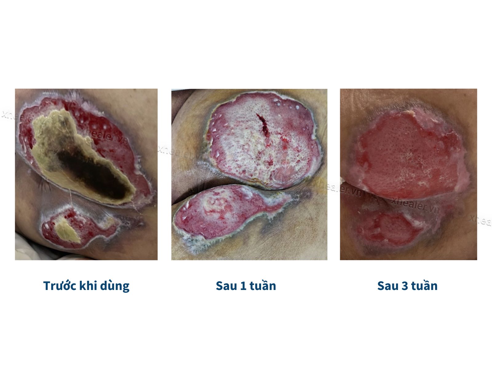 Đây đều là những yếu tố làm tăng nguy cơ vết loét không lành và diễn tiến nặng hơn. Do đó bên cạnh việc điều trị nhiễm trùng đường mật, kiểm soát tốt các bệnh lý nền, BN được cắt lọc vết thương, thay băng mỗi ngày và xoay trở mỗi giờ, đồng thời bổ sung các acid amin chuyên biệt giúp nhanh lành vết thương, tăng cường miễn dịch bằng sản phẩm X-Healer 3 gói/ngày. Sau 3 tuần, vết loét không còn giả mạc, lên mô hạt nhanh chóng và dịch tiết giảm rõ rệt.
