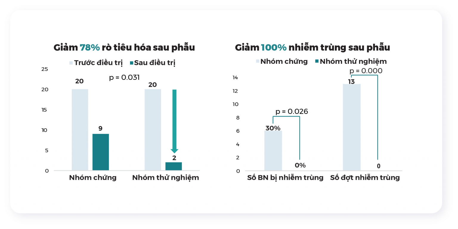 Nghiên cứu của Martinez đã chứng minh được việc sử dụng phối hợp chứa L-Arginine, L-Glutamine sẽ giúp giảm tỷ lệ biến chứng rò tiêu hóa, nhiễm trùng vết thương phẫu thuật, đồng thời rút ngắn thời gian nằm viện sau phẫu thuật, giúp bệnh nhân nhanh lành vết thương hơn [10].