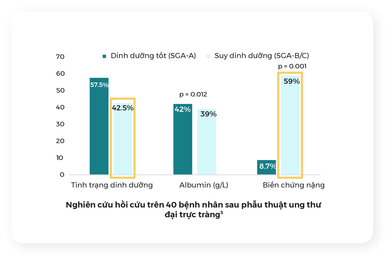 Nghiên cứu của Nishiyama và cộng sự năm 2018 trên các bệnh nhân sau phẫu thuật ung thư đại trực tràng cho thấy khoảng 43% bệnh nhân bị suy dinh dưỡng và 59% bệnh nhân bị biến chứng nặng sau phẫu thuật ở nhóm suy dinh dưỡng [5]. Nghiên cứu khác của Loan BTH, Nakahara S. năm 2018 trên bệnh nhân phẫu thuật ung thư đường tiêu hóa cũng cho thấy bệnh nhân suy dinh dưỡng tăng gấp 2 lần nguy cơ biến chứng sau phẫu thuật và thời gian nằm viện cũng kéo dài hơn [6].
