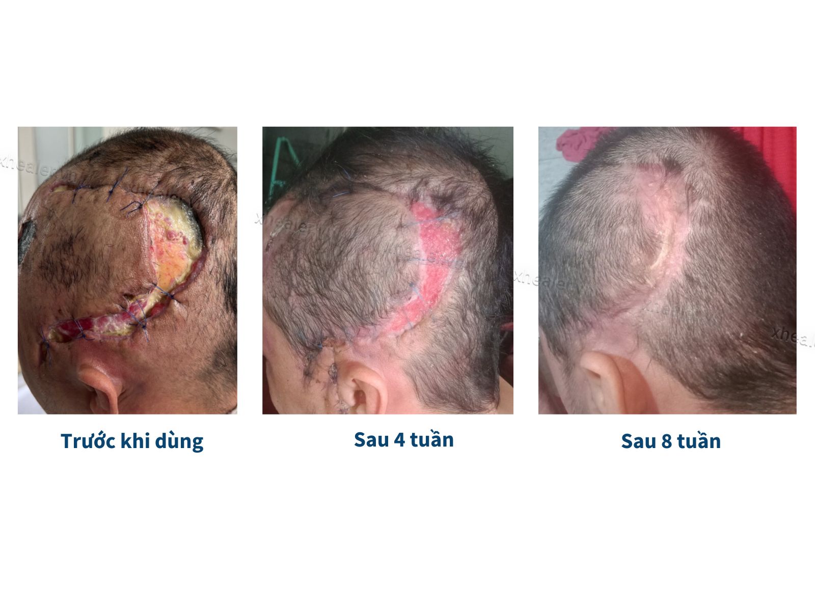 Bệnh nhân bị mắc bệnh tiểu đường 5 năm, bỏ trị cách đây 1 năm. Bệnh nhân bị vết thương vùng đầu, nhiễm trùng lan rộng không kiểm soát, phải nhập bệnh viện vào khoa hồi sức 20 ngày. Sau đó được chuyển viện, tiếp tục điều trị tại bệnh viện khác. Tình trạng vết thương lúc này diễn tiến lành chậm, tiết nhiều dịch. Kết hợp với các phương pháp ngoại khoa như phẫu thuật cắt lọc, làm sạch vết thương, khâu vết thương phần mềm, BN được bổ sung các acid amin chuyên biệt để đẩy nhanh quá trình lành vết thương bằng X-Healer với liều tối ưu 3 gói/ngày. Sau 4 tuần, vết thương lên mô hạt tốt, giảm tiết dịch và sau 8 tuần, vết thương gần như lành hoàn toàn